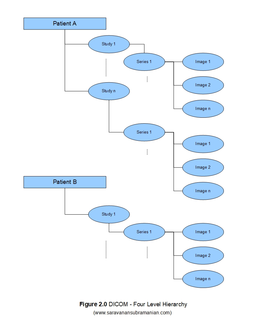 In my previous two tutorials, I mentioned the standard hierarchy that DICOM uses when encoding information which is that a patient may have one or more studies, each study in turn consisting of one or more series, and each series in turn consisting of one or more DICOM images. People that are new to the DICOM world are often surprised to find that most DICOM implementations by default only permit queries in a hierarchal manner (you need to know the patient to find the study, the study to find the series, and the series to find the image). This is somewhat different from dealing with systems built on the relational approach where you can retrieve information as long as you know some information regarding the entity. Although most modern DICOM systems implement both approaches, understanding the significance of the patient id, the study instance id, the series instance id and SOP instance id data elements is very important for DICOM related processing as all these attributes are often required to “zoom in” on the data that is of interest to you.