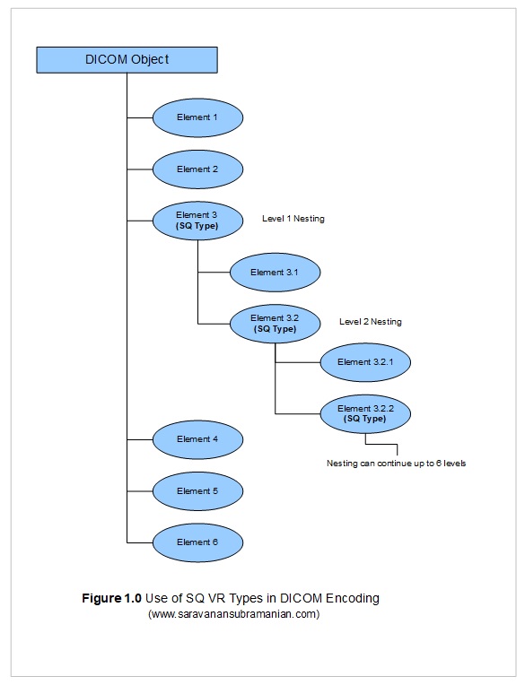 In my previous tutorial that covered the structure of a DICOM file, I touched very briefly on a type of value representation called Sequence Types (often referred to as SQ). This type plays a very significant role in DICOM data encoding. Entire sequences of DICOM objects can be encoded using a single SQ VR (see Figure 1.0 below). Unlike other DICOM data elements, a SQ element has no data of its own. Instead, it simply contains a sequence of other DICOM objects within. Moreover, these child elements themselves may be SQ types and may also contain child elements. As a result, you may sometimes see multiple nesting levels when dealing with DICOM data (some time up to 6 levels deep).